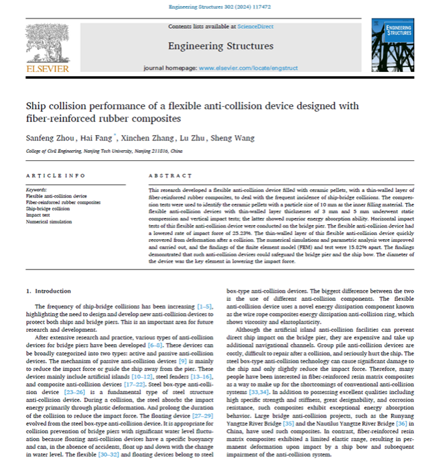 999策略白菜手机论坛复合材料结构学术团队方海教授课题组在国际权威学术期刊《Engineering Structures》(中科院一区TOP期刊,IF=5.5)上发表题为“Ship collision performance of a flexible anti-collision device designed with fiber-reinforced rubber composites”的研究论文。2021级硕士研究生周三峰为该论文的第一作者,方海教授为通讯作者,其他作者分别为张新晨、祝露、王盛。该研究得到了国家自然科学基金(项目编号52078248)和江苏省研究生科研与实践创新计划(项目编号KYCX23_1459)的资助。
