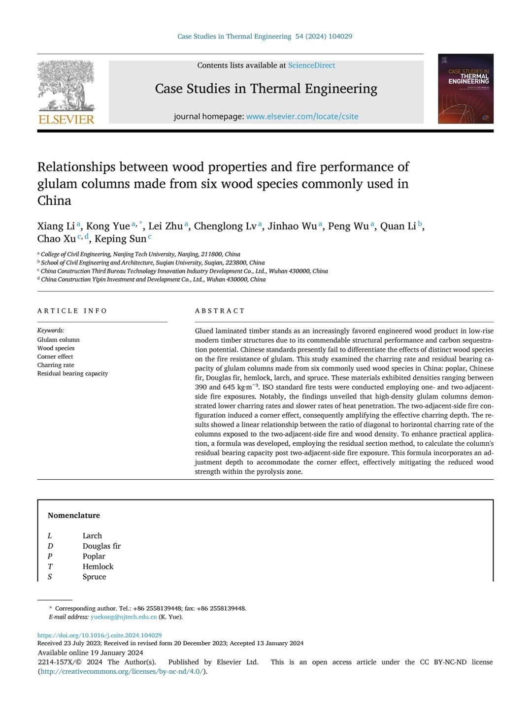 999策略白菜手机论坛木结构学术团队岳孔教授课题组在国际权威学术期刊《Case Studies in Thermal Engineering》(中科院大类学科:工程技术2区,小类学科:热力学2区,TOP期刊,IF=6.8)上发表题为“Relationships between wood properties and fire performance of glulam columns made from six wood species commonly used in China”的研究论文。白菜官网2022级硕士生李响为该论文的第一作者,岳孔教授为通讯作者,其他作者分别为2023级硕士生朱磊、2020级博士生吕城龙、2018级硕士生吴金浩、吴鹏副教授,以及合作单位的李权、徐超和孙克平。该研究得到了国家自然科学基金项目(项目编号:5197833152108220)与江苏省农业科技自主创新资金项目(项目编号:CX(22)3055)的资助。