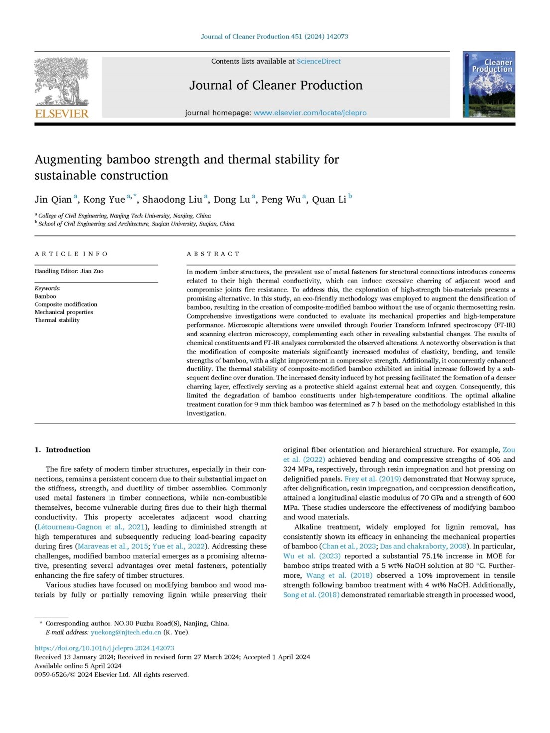 999策略白菜手机论坛木结构学术团队岳孔教授课题组在国际权威学术期刊《Journal of Cleaner Production》(中科院大类学科:环境科学与生态学1区,TOP期刊,IF=11.1)上发表题为“Augmenting bamboo strength and thermal stability for sustainable construction”的研究论文。2022级硕士生钱锦为该论文的第一作者,岳孔教授为通讯作者,其他作者分别为2020级硕士生刘少东、2020级硕士生陆栋、吴鹏副教授,以及合作单位的李权。该研究得到了国家自然科学基金项目(项目编号:51978331和52108220)与江苏省农业科技自主创新资金项目(项目编号:CX(22)3055)的资助。