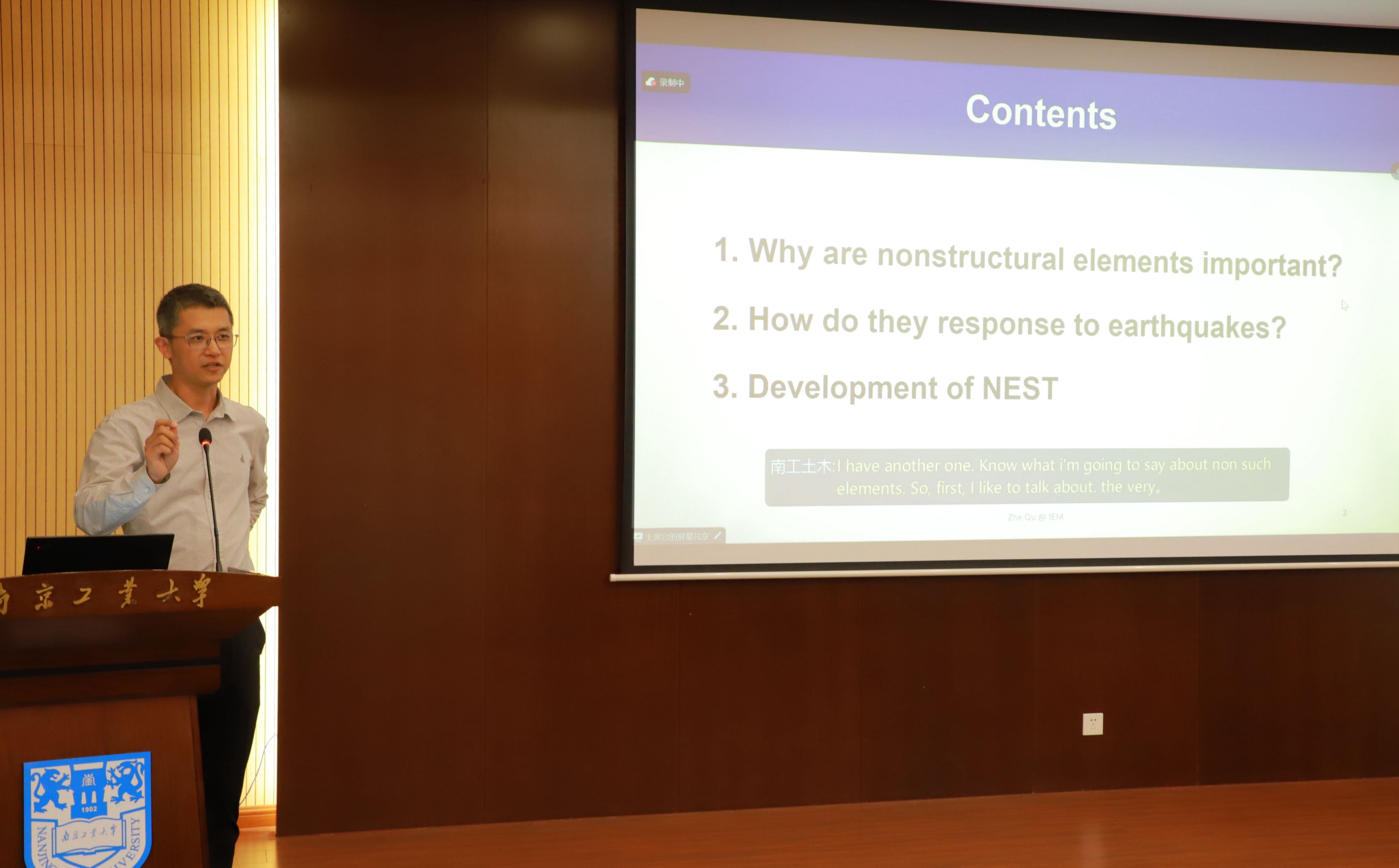 曲哲研究员做了题为《Experimental Simulation of the Seismic Damage to Nonstructural Elements in Buildings》的报告,深入剖析了近年来在国内外地震中非结构构件的损伤情况,指出非结构构件是目前抗震设计中的薄弱环节。随后展示了团队针对填充墙、吊顶以及建筑内浮放物品等非结构构件在地震下的复杂动力行为所开展的理论分析、数值模拟及试验研究方面的最新进展,揭示了非结构构件地震损伤机理。最后,针对非结构构件在地震过程中的响应复杂性,敏感性的问题,曲哲研究员提出了非结构单元模拟振动台(NEST)系统,对该系统的研发进行了详细的介绍,并展示了利用该系统所开展的试验研究。最后,曲哲研究员寄语学员们积极探索数智技术在地震工程中的应用潜力。