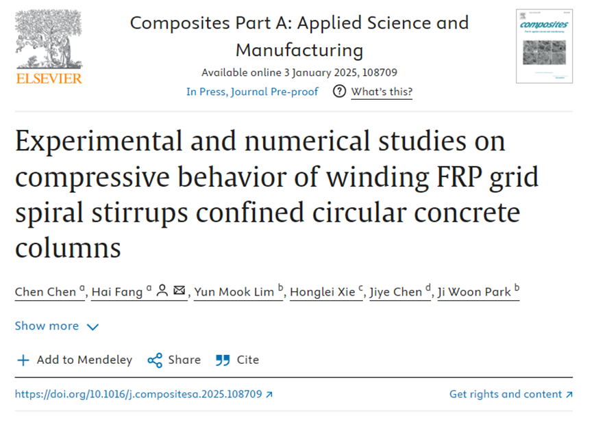 999策略白菜手机论坛999论坛白菜大全方海教授团队在复材结构领域国际权威期刊《Composites Part A: Applied Science and Manufacturing》(TOP期刊,IF=8.1)发表题为“Experimental and numerical studies on compressive behavior of winding FRP grid spiral stirrups confined circular concrete columns”的研究论文。该论文第一作者为2022级博士研究生陈忱,通讯作者为方海教授,共同作者还有韩国延世大学Yun Mook Lim教授。
