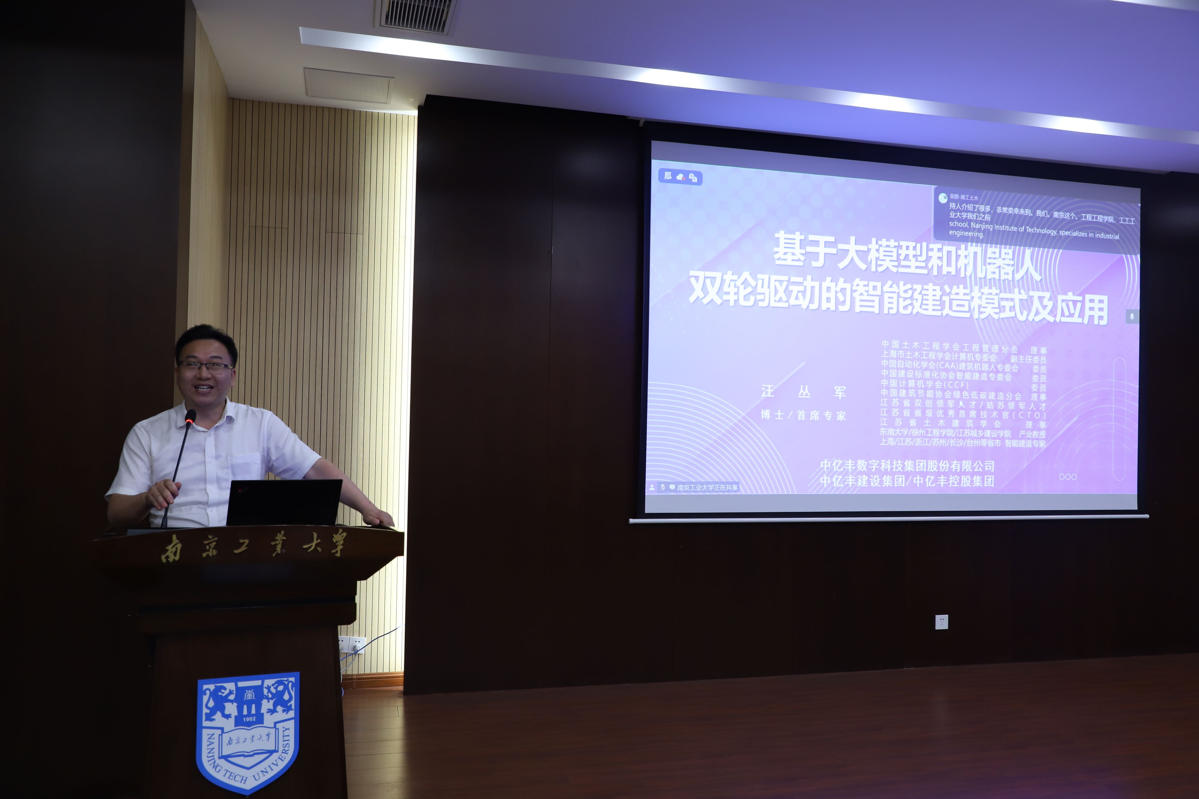 中亿丰建设集团股份有限公司总经理汪丛军博士带来了一场题为《基于AI大模型与机器人双轮驱动的智能建造模式与应用》的学术报告。汪总经理针对当前我国土木工程领域面临的如何转型的问题,他认为智能建造是不可避免的大趋势,而如何转型是需要慎重思考的,他指出使用数字技术对工程建造赋能是一种可行性很好的方法。汪总经理指出未来的工程建造中数据已经成为工程领域的生产要素,人、机、材、数构成的人机协作的生产施工才应该是智能建造的方式。而且,工程结构部品部件的标准化才应该是智能生产的正确模式。报告引发线上线下热烈讨论,学生们充满了好奇心,纷纷就智能建造等提出问题,汪总经理逐一详细解答,现场气氛活跃。
