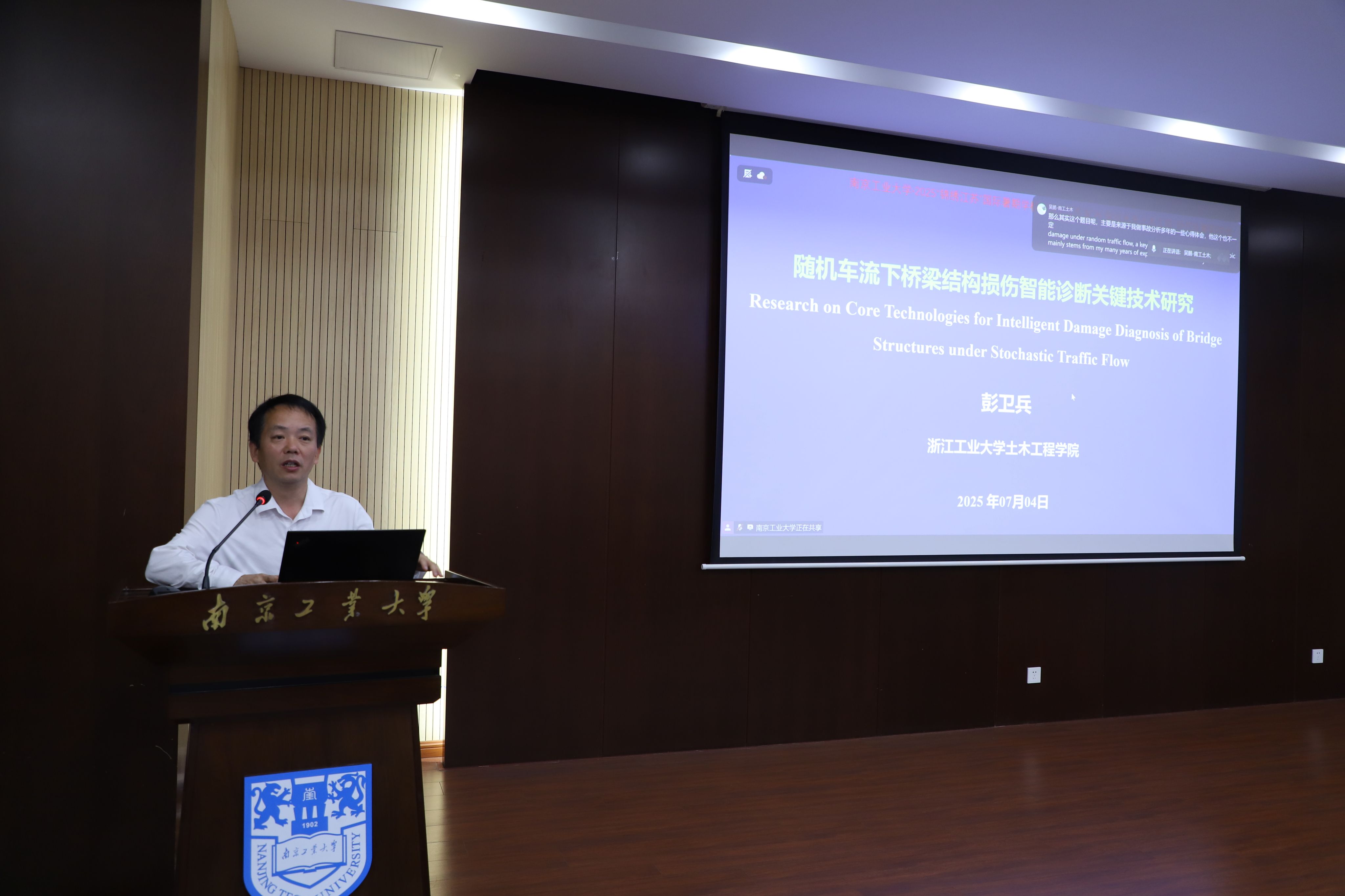 浙江工业大学彭卫兵教授在本次学术交流会上,带来了一场题为《随机车流下桥梁结构损伤智能诊断关键技术研究》的精彩汇报。彭教授分享了自己从实际桥梁工程倒塌事故分析经验中提取总结科学问题的研究经验。彭教授指出从诸如宁波余姚方桥安徽池州市东至县及贵州夏蓉告诉猴子河特大桥等多起桥梁倾覆倒塌典型事故分析可以认识到桥梁倾覆事故灾害是重要的研究内容。彭教授详实介绍了他近些年提出的关于基于变形体的抗倾覆计算方法的研究内容。彭教授建议应把目前桥梁设计规范给出的倾覆系数应从2.5调整到5.0以满足桥梁的抗倾覆安全指标。此外,彭教授还详细介绍了再随机车流下桥梁结构损伤智能诊断等研究内容。彭教授建议使用非常少的传感器进行桥梁损伤的识别诊断,并指出车脸识别和声音识别诊断车辆类型的准确率可高达90%以上。彭教授的报告引发线上线下热烈讨论,学员们纷纷就桥梁损伤和智能识别等提出问题,彭教授逐一详细解答,现场气氛活跃。