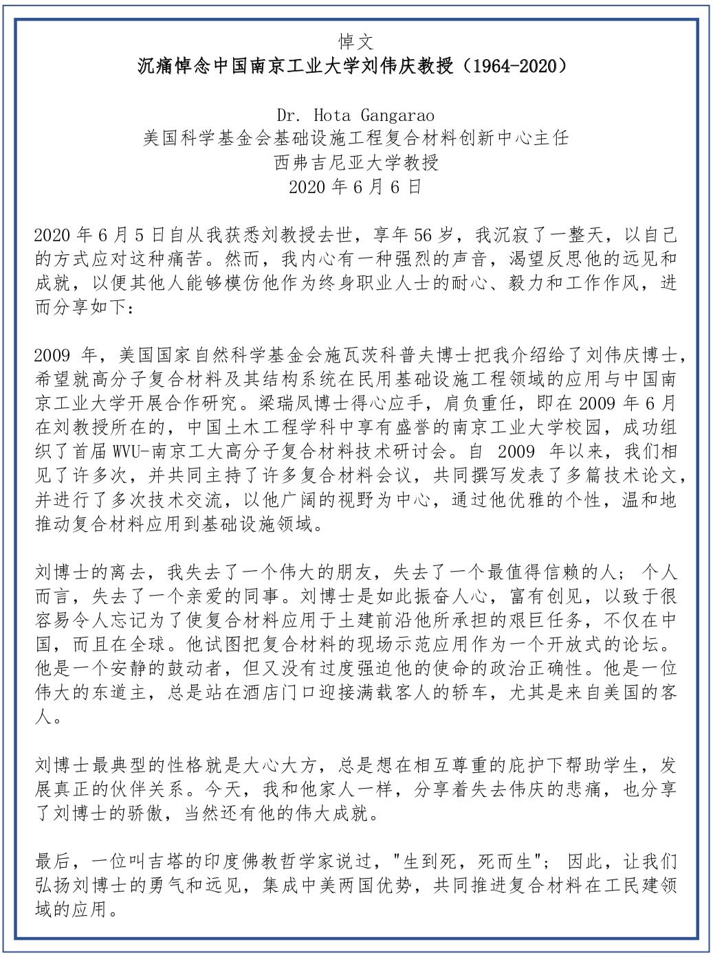 Dr.Hota Gangarao深切缅怀刘伟庆教授