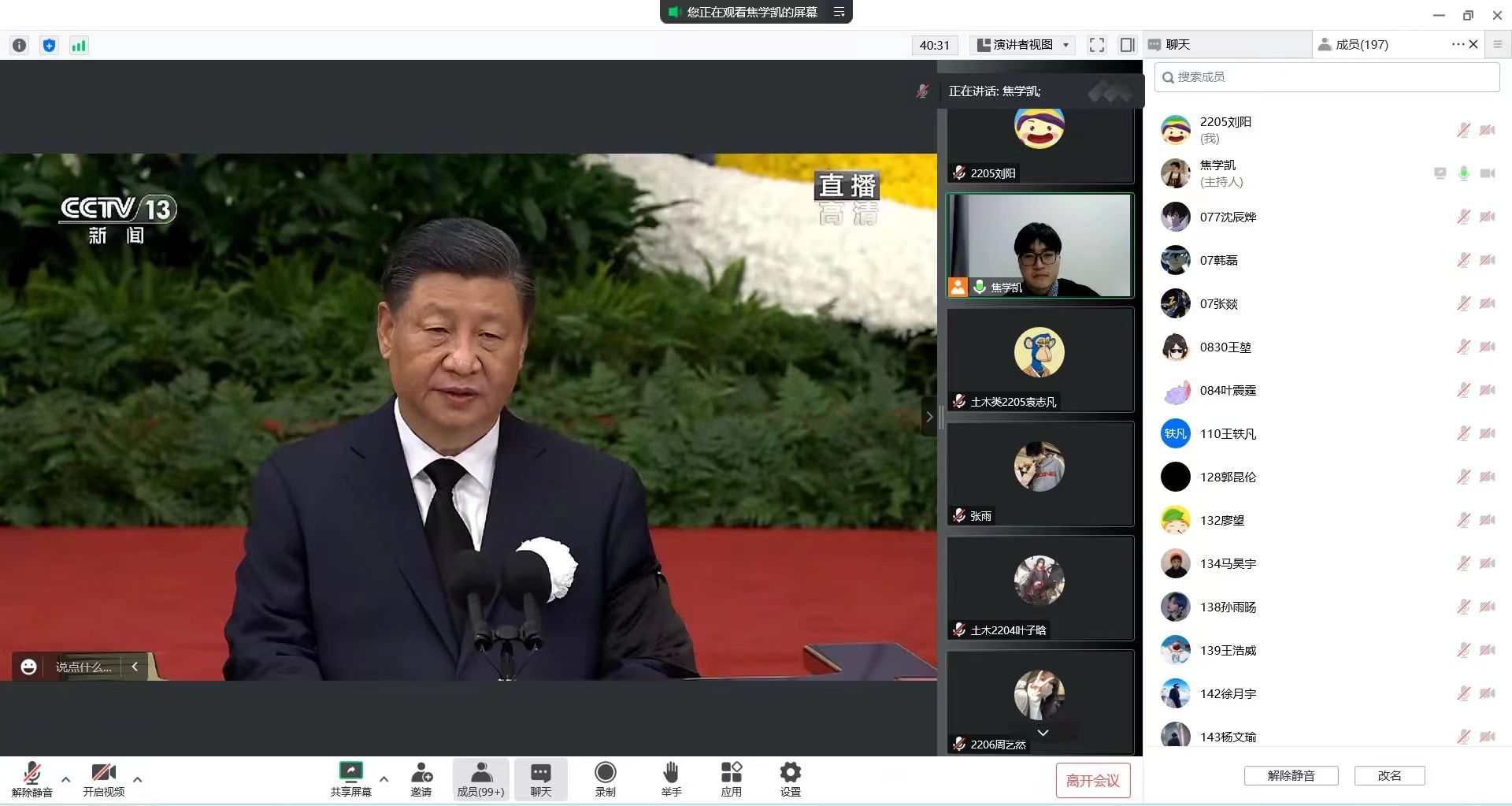 首先,大家认真了学习了习近平总书记在江泽民同志追悼大会上致的悼词。与会同学表示,深切缅怀江泽民同志的丰功伟绩和崇高风范,决心在以习近平同志为核心的党中央坚强领导下,坚持以习近平新时代中国特色社会主义思想为指导,全面贯彻党的二十大精神,发挥青年一代作为社会主义建设的生力军作用,坚定理想信念、练就过硬本领、理论联系实践,用所学专业知识报效祖国。