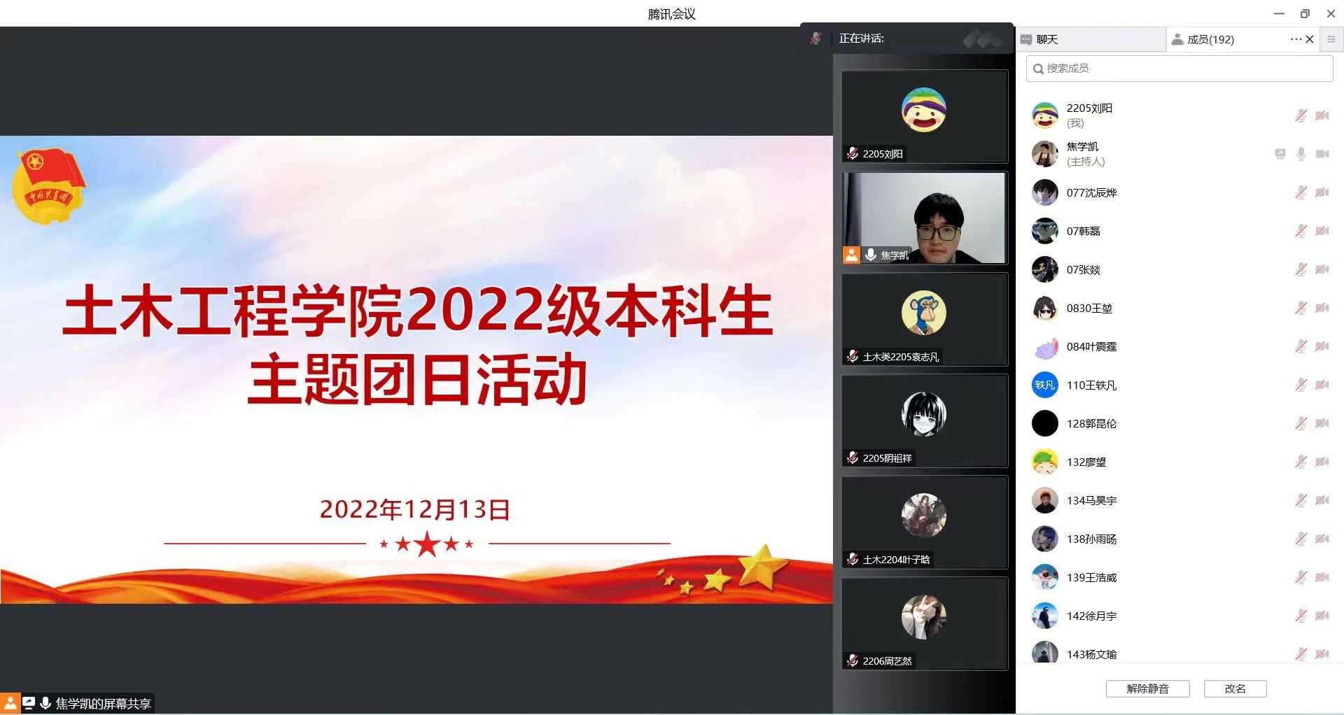 12月13日,为加强对团员青年的教育引导工作,营造健康向上的良好氛围,999论坛白菜大全22级本科生8个团支部通过线上形式联合开展主题团日活动,活动由辅导员焦学凯老师主持。