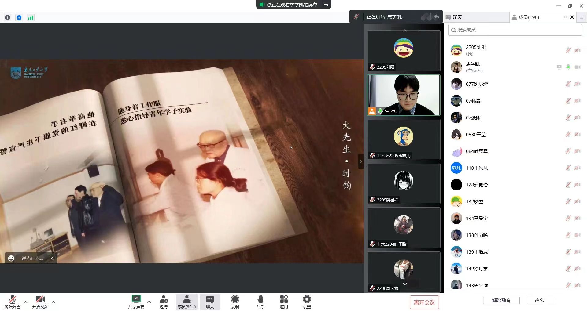 随后,为纪念时钧先生诞辰110周年,进一步深入宣传和弘扬时钧精神,传承并彰显学校宝贵的精神文化,激励所有团支部成员在时钧精神润泽与感召下不断赓续前行,各团支部成员共同观看了由档案馆牵头制作的视频《大先生•时钧》,紧接着在时钧精神演讲比赛一等奖获得者土木类2204班江孝同学的带领下,分别从忠党爱国、淡泊坚韧、求实惟先、扶掖后学四个方面详细学习了时钧精神。