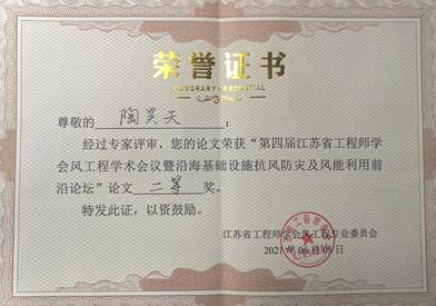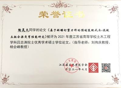 江苏省优秀学术学位硕士学位论文获得者,江苏省高等学校土木工程学科吕志涛院士优秀学术硕士学位论文获得者,江苏省土木工程专业优秀毕业生(硕士),江苏省土木建筑学会竹木结构专业委员会委员等。以第一作者身份发表学术论文5篇,其中SCI论文3篇、Top期刊论文2篇,EI论文2篇;以合作作者身份发表学术论文5篇。获软件著作1件,授权实用新型专利1件。这位南工大学子几乎包揽所有硕士阶段的重要奖项,本硕七年的时间里,999论坛白菜大全毕业生陶昊天总是别人眼里优秀的代表。