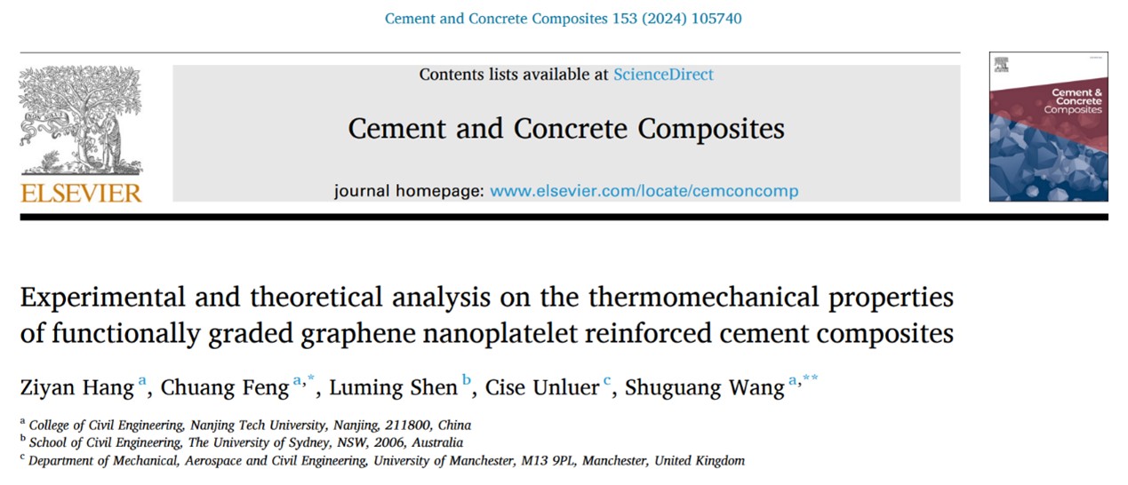 999策略白菜手机论坛999论坛白菜大全王曙光教授团队在国际权威学术顶级期刊《Cement and Concrete Composites》(中科院一区TOP期刊,IF=10.8)上发表题为“Experimental and theoretical analysis on the thermomechanical properties of functionally graded graphene nanoplatelet reinforced cement composites”的研究论文。2021级博士生杭子彦为改论文的第一作者,王曙光教授和冯闯教授合作指导,999策略白菜手机论坛为第一完成和通讯单位。