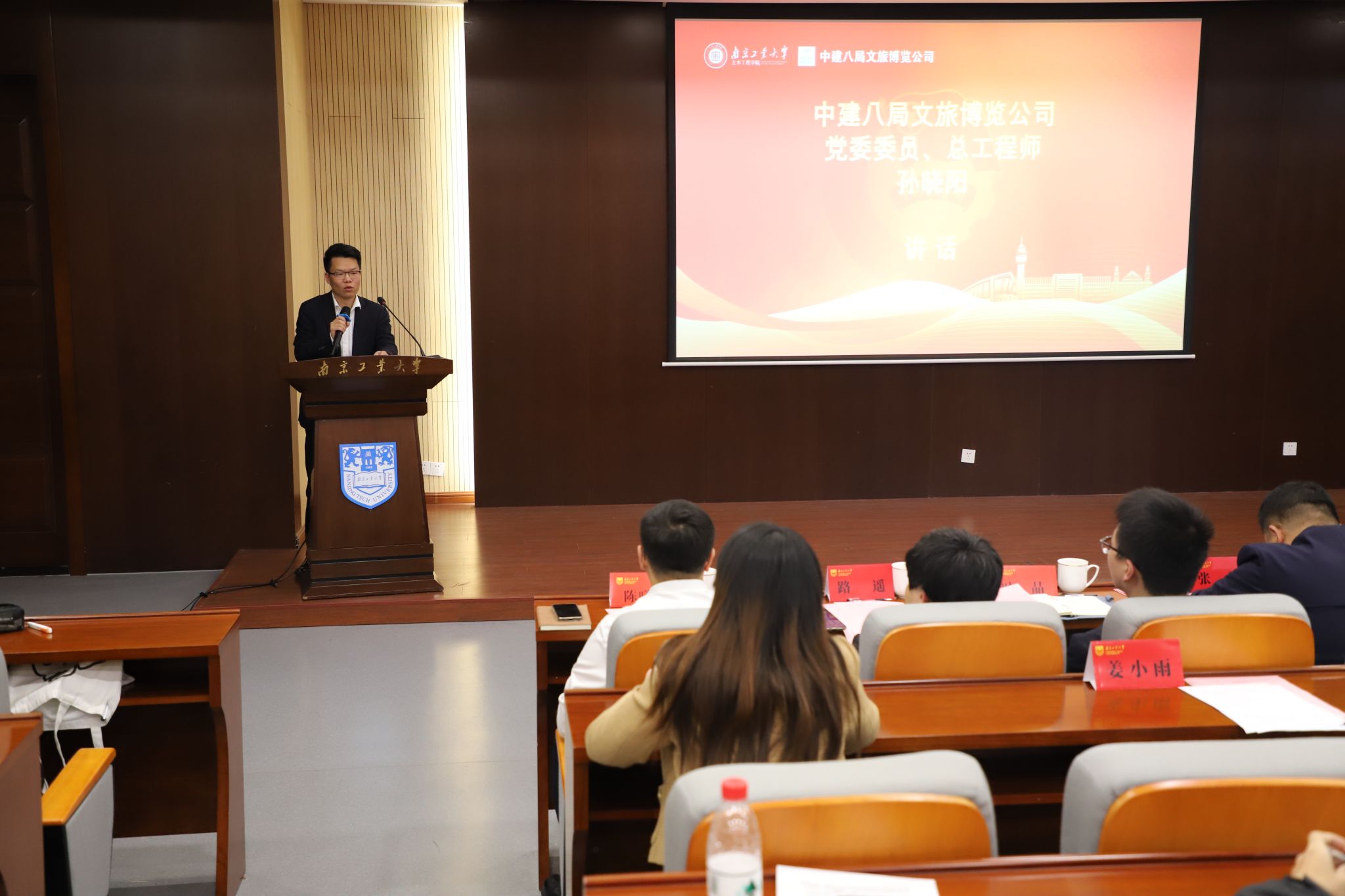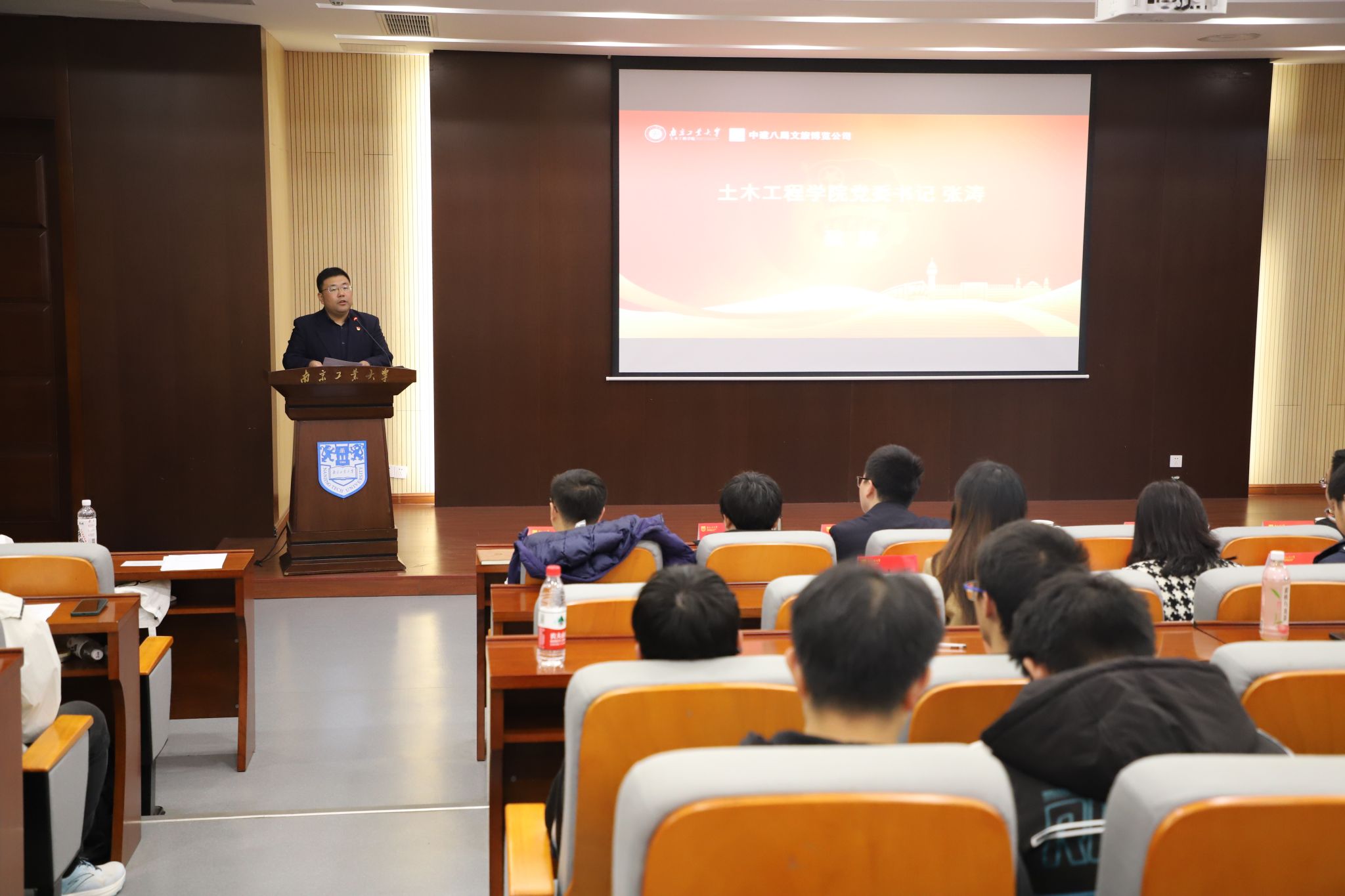 张涛书记对中建八局文旅博览公司的到来表示热烈欢迎,希望通过“思政引领+校企合作”的方式,进一步发挥产教融合品牌特色。王郁超书记在讲话中充分肯定了产教融合的育人模式,希望我院团员青年通过此次活动,相互学习、增进交流、内化于心、外化于行。