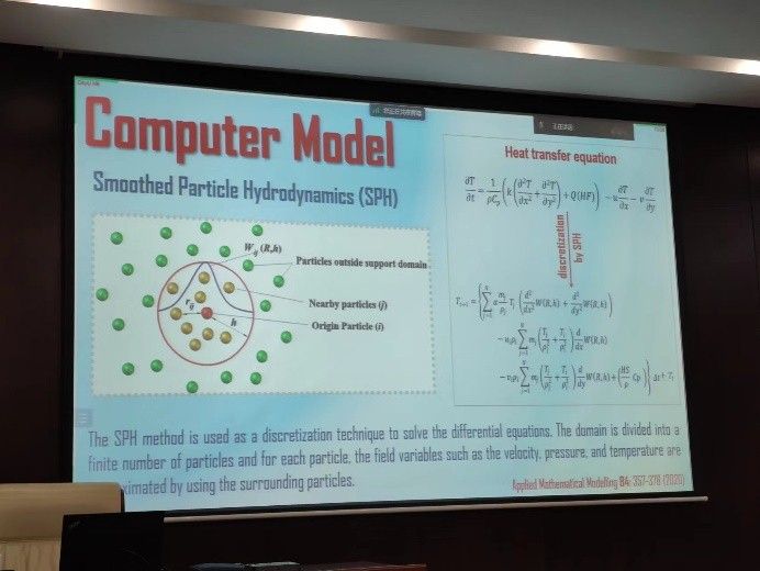 报告会上,刘锦茂院士首先对玻璃幕墙的优良性能做了简单介绍,强调了目前玻璃幕墙在建筑行业应用的广泛性和研究玻璃幕墙火灾模拟计算的重要性。然后,详细介绍了基于平滑粒子流体动力学(SPH)技术的计算框架,试验对比下此方法对模拟火灾作用下玻璃幕墙温度分布的高精确度。该方法为玻璃幕墙的防火设计具有很高的工程意义和学术价值。