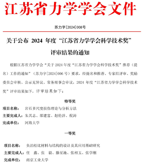 近日,江苏省力学学会公布了2024年度“江苏省力学学会科学技术奖”评审结果,我院任鑫教授以第一完成人、999策略白菜手机论坛为唯一完成单位申报的“负泊松比材料与结构的设计及其应用基础研究”,荣获江苏省力学学会科学技术一等奖。